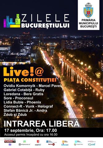 In data de 17 septembrie, in Piata Constitutiei, Primaria Capitalei prin ARCUB – Centrul Cultural al Municipiului Bucuresti, organizeaza un concert eveniment, cu cei mai iubiti artisti pop-rock ai momentului: Andra, Stefan Banica Jr, Zdob si Zdub, Holograf, Vunk, Bere Gratis, Sore, Loredana, Ruby, Connect-R, Gabriel Cotabita, Marcel Pavel, Ovidiu Komornyic, Proconsul, Phoenix sau Lidia Buble.